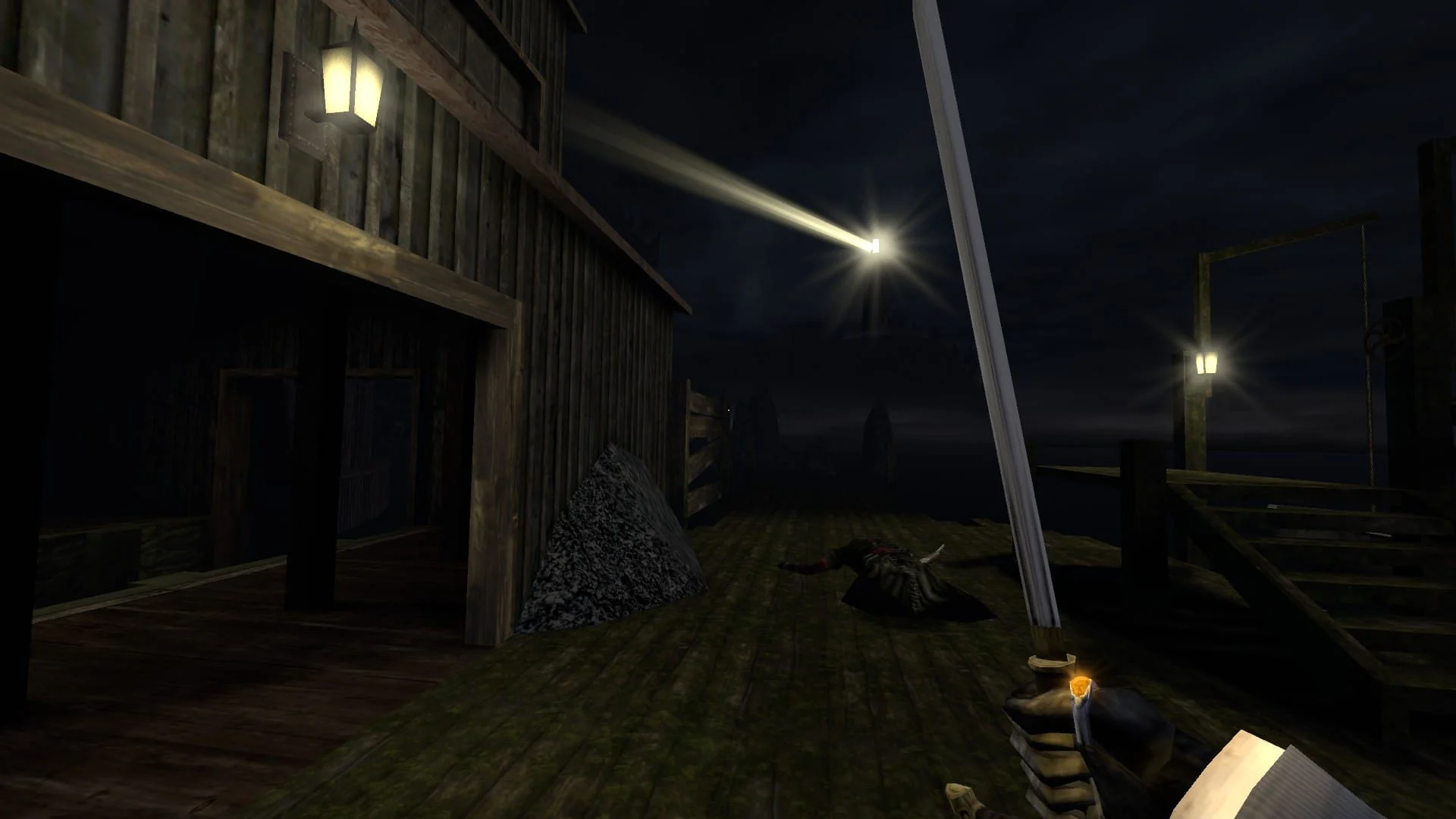 În Gloomwood, un element la fel de important precum stealth-ul este lumina, așa cum a fost și în Thief. Avem în față un joc foarte întunecat, iar nivelurile din Early Access se desfășoară pe timp de noapte, dar plasarea intenționată a surselor de lumină, cum ar fi felinarele și lumânările, permite gardienilor să te ia în colimator dacă pășești în raza de iluminare a acestora. Poți să stingi lumânările sau să modifici intensitatea luminii în anumite zone pentru a evita paznicii, dar uneori nu ai această posibilitate. O utilizare inteligentă a sistemului de lumină am întâlnit-o prin intermediul farului din port. Când acesta se rotește, așa cum te-ai aștepta din partea oricărui far, îți oferă o fereastră scurtă de timp în care te poți strecura fără să fii descoperit. Sper ca în produsul final să se regăsească mai multe oportunități ca aceasta pentru a adăuga o doză de strategie mecanicii de stealth.