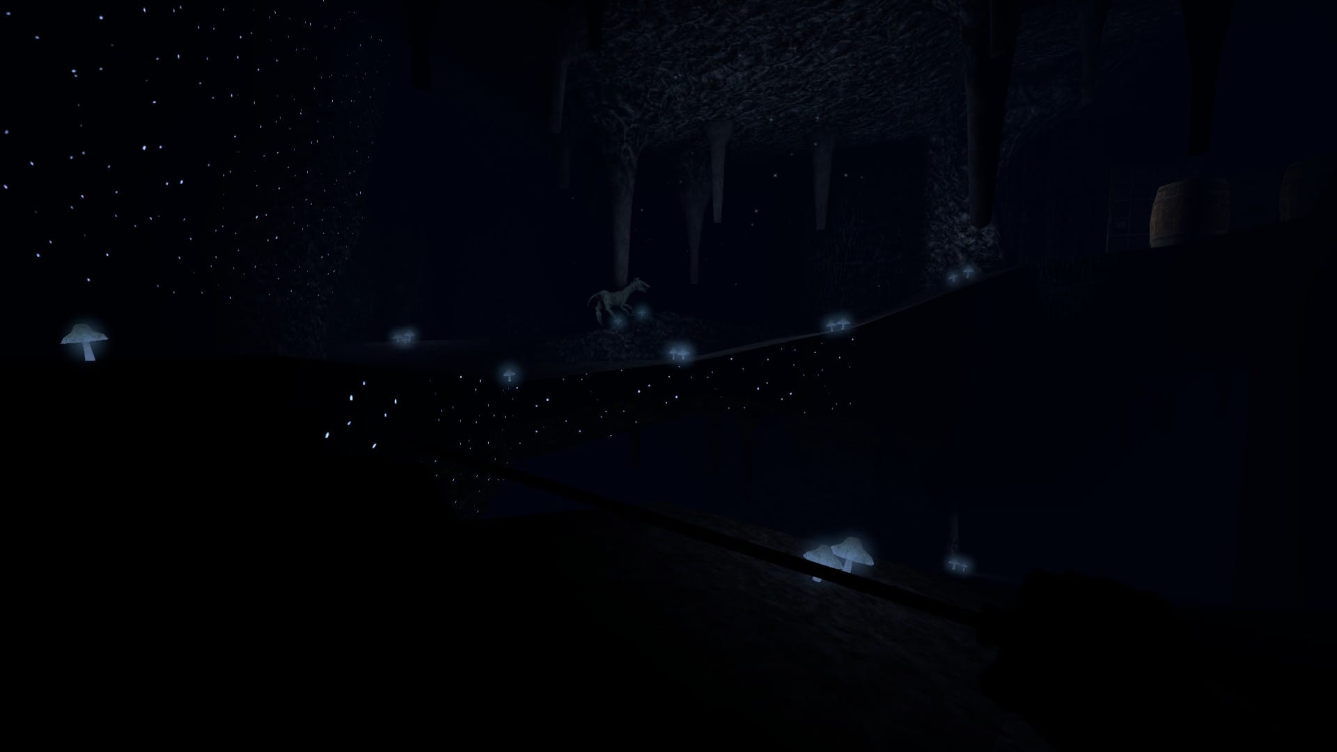 Să tot bat apa în piuă despre cât de captivant este Gloomwood ar fi repetitiv în acest ritm, dar nu pot decât să admir cât de atmosferic este jocul, în ciuda faptului că este un joc foarte, foarte întunecat. În sistemul de peșteri am întâlnit un detaliu plăcut retinei, pe pereții acestora strălucind o puzderie de luminițe asemănătoare stelelor(și multe ciuperci cel mai probabil, radioactive). Din zona farului poți vedea un alt oraș victorian în depărtare, luminând cerul nopții. Totul este atât de bine încât atributul de immersive sim i se potrivește ca o mănușă lui Gloomwood.