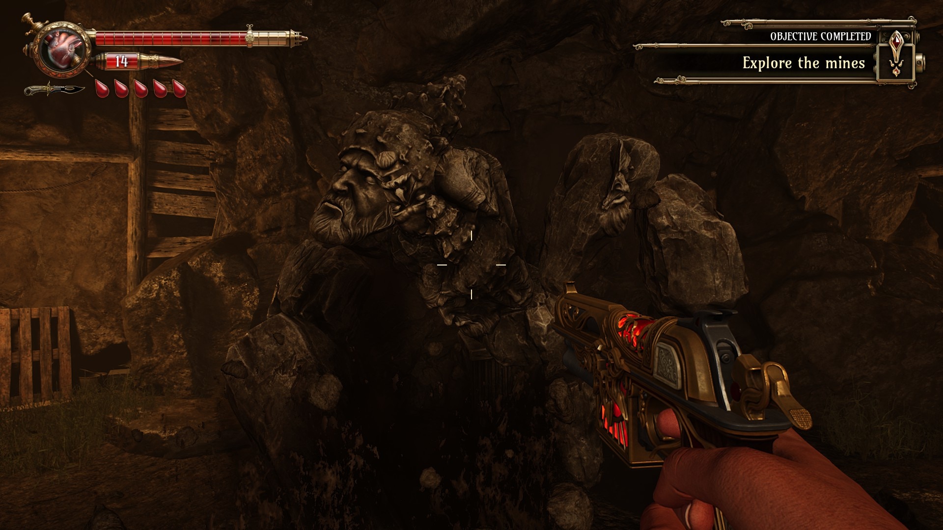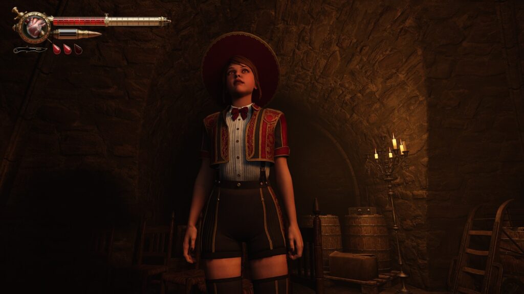 Pistolul cu care începi jocul e calul de bătaie. Consumă mai puțin sânge când îl reîncarci, deci e prietenos cu bara ta de viață, dar și damage-ul e modest, după cum ziceam. E genul de armă pe care o folosești constant, pentru că e eficientă și predictibilă, însă nu impresionează prin nimic. Pentru apropiere ai pumnalul, care se tocește după câteva lovituri. Poți să ciopârțești manechinele cât vrei, dar la un moment dat trebuie să găsești o stație de ascuțire. Și benzină pentru motorul de motocicletă care învârte piatra de ascuțit. Ca idee e mișto că te forțează să nu abuzezi de melee, dar în practică devine un mini fetch quest de rutină. Există și un parry cu pumnalul, însă fereastra e destul de strictă și, nici nu simți că merită riscul. De cele mai multe ori, e mai sigur să păstrezi distanța și să tragi cu plumbi.