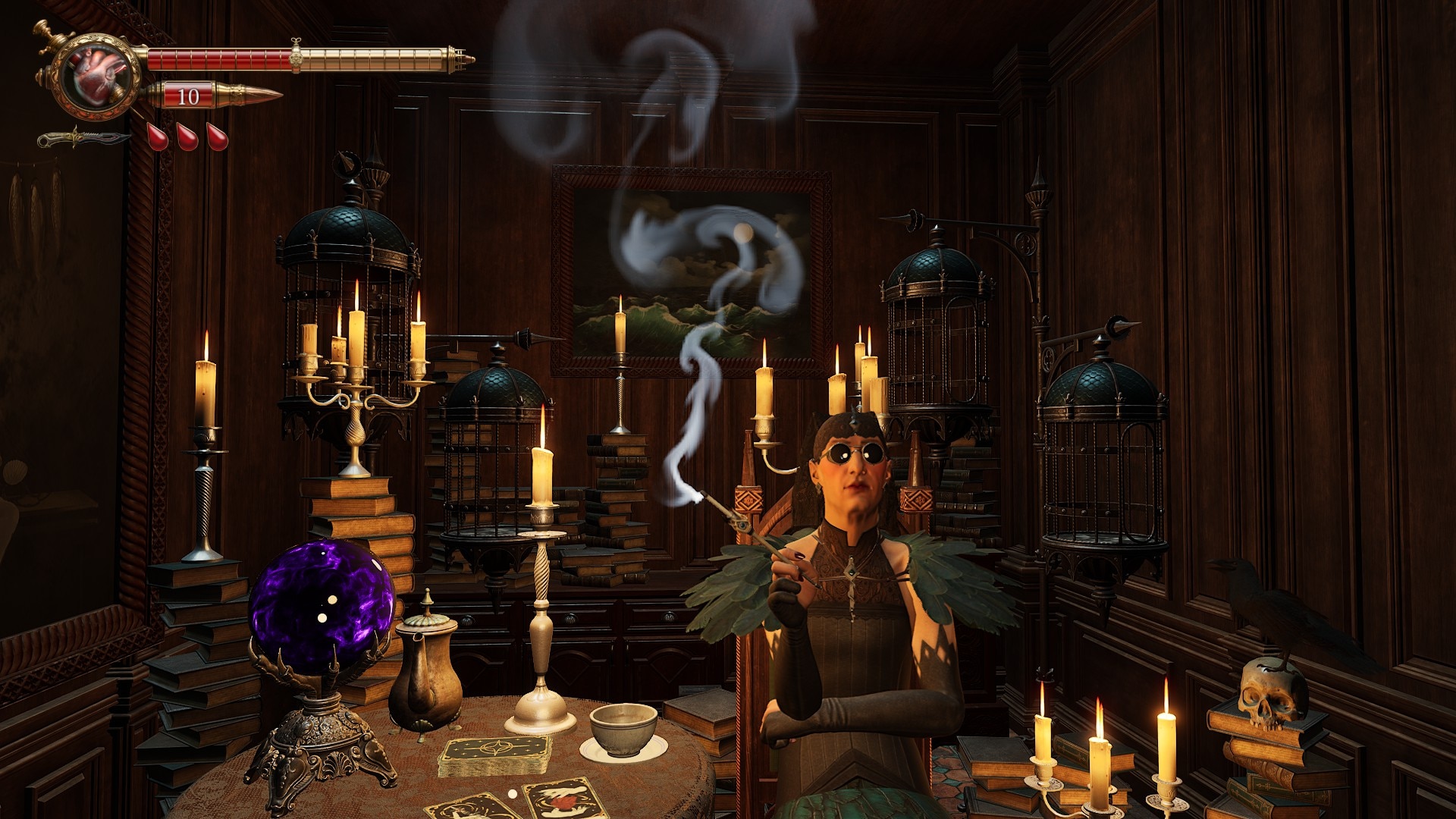 Avem și un sistem de upgrade pentru arsenal și pentru Gabriel, care poate fi accesat din locațiile în care apare o „vrăjitoare”, care funcționează și ca punct de salvare. Ca resurse necesare, îți trebuie Silver bulls, care sunt monedele de argint pe care le găsești explorând natural jocul, și pe astea le folosești pentru îmbunătățirea armamentului. Apoi mai ai Essence care funcționează ca puncte de experiență după fiecare luptă, și Crows, care… e de la sine înțeles, sunt corbi pe care, dacă îi găsești, fă bine și eliberează-i din colivii, pentru că pe astea din urmă le vei folosi pentru abilitățile lui Gabriel.