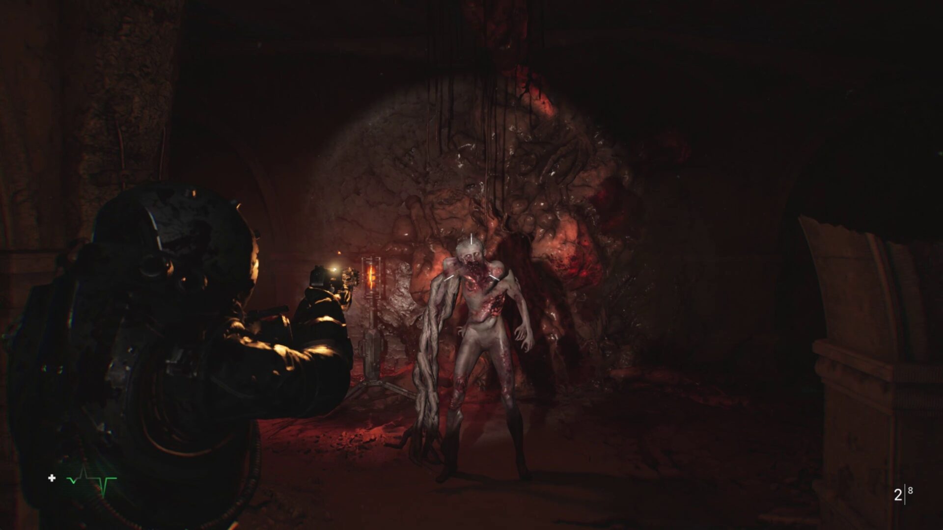 Aici nu e vorba doar de un simplu artificiu de gameplay, ci de un element cheie al rețetei conturate de Bloober. Odată ce învingi o astfel de creatură, dacă nu ai suficient combustibil să-i arzi cadavrul cu flamethrower-ul portabil, va trebui să fii foarte atent la mișcările inamicilor din apropiere: dacă unul dintre ei reușește să absoarbă materialul genetic al celui căzut, te așteaptă o bătălie pe cinste.