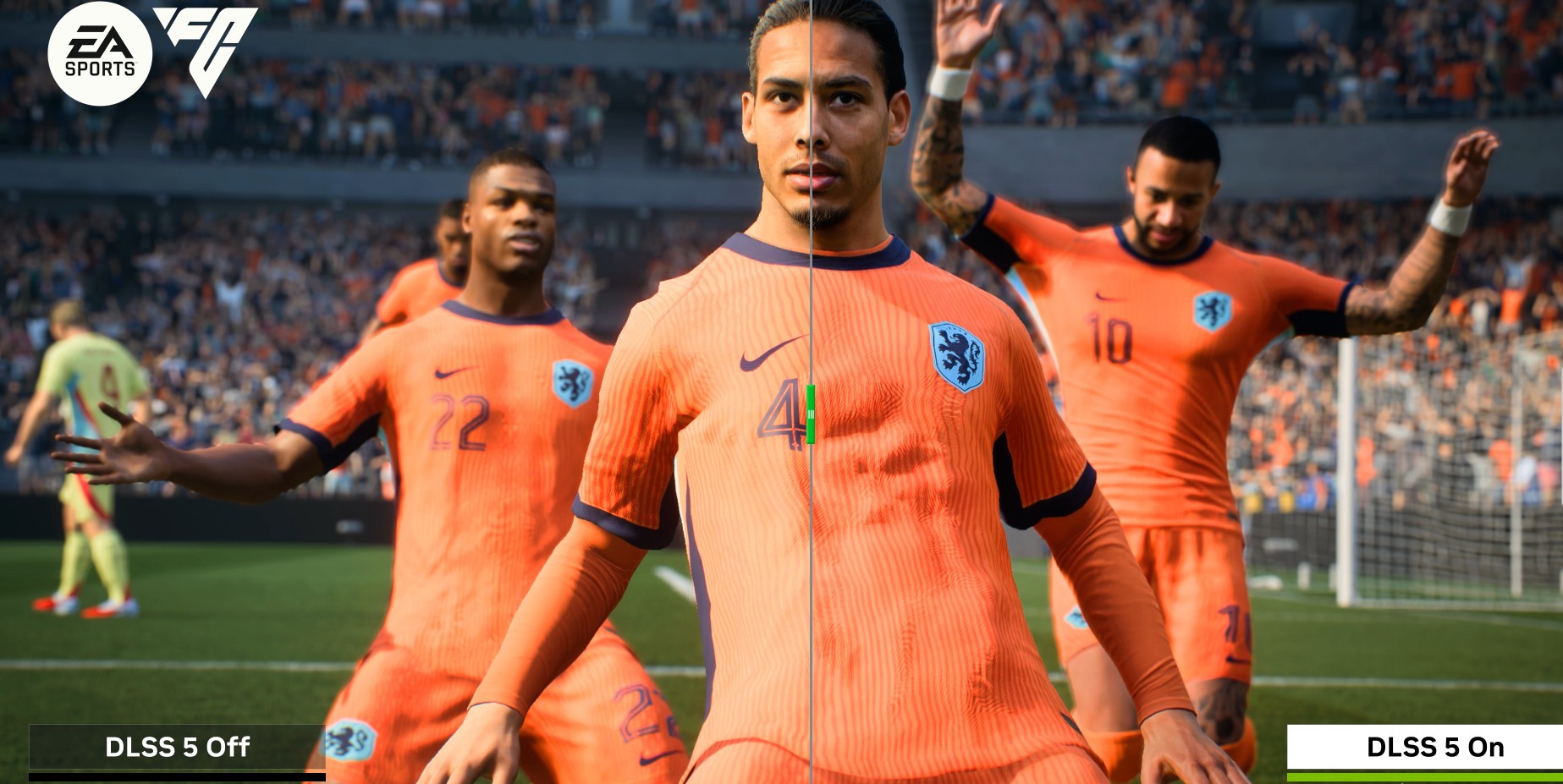 Videoclipul demonstrativ ne prezintă mai multe jocuri: Resident Evil Requiem, Starfield, Hogwarts Legacy și EA Sports FC. Și cel puțin se poate spune că efectul este… izbitor. Nvidia, desigur, nu se încurcă cu mărunțișuri și scoate artileria grea – cinematografia – într-o postare pe blog: „Reducând decalajul dintre randare și realitate, DLSS 5 permite dezvoltatorilor de jocuri să ofere un nou nivel de grafică fotorealistă în timp real, atins anterior doar în efectele vizuale de la Hollywood.” La rândul său, Jensen Huang, fondator și CEO al NVIDIA declară vizibil excitat că „DLSS 5 este momentul GPT pentru grafică – combinând randarea manuală cu inteligența artificială generativă pentru a oferi un salt dramatic în realismul vizual, păstrând în același timp controlul de care au nevoie artiștii pentru exprimarea creativă.” Așadar, Nvidia îți spune că nu mai joci un joc, ci asiști la un fel de fantezie neuronală în care AI-ul decide că fața fotbalistului tău preferat (Vergiliu van Dijk, în cazul de mai jos) arată mai a Hollywood dacă îi adaugă niște umbre dramatice și un luciu de superstar; sau, dacă joci un RPG, fața eroinei tale s-ar putea trezi subit cu un „lifting” digital nesolicitat: AI-ul decide că pomeții ei trebuie să fie mai proeminenți, tenul mai de porțelan și privirea mai plină de sclipiri cinematografice, transformând-o dintr-o supraviețuitoare în noroi într-o divă numai bună de parade pe covorul roșu…