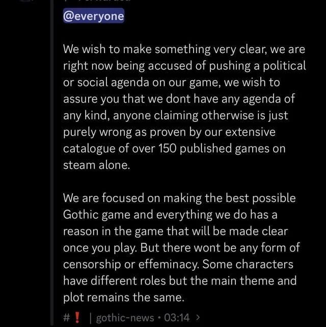 După ce echipa de dezvoltare de la Alkimia Interactive s-a limitat să modereze discuțiile de pe canalele lor de socializare și să elimine cele mai agresive comentarii, iată că acum au ieșit cu explicații: „Dorim să clarificăm faptul că nu urmărim niciun fel de agendă, deoarece suntem acuzați în prezent că promovăm o anumită agendă politică în jocul nostru. Oricine susține contrariul greșește, după cum demonstrează catalogul nostru de peste 150 de jocuri publicate doar pe Steam. Ne concentrăm pe crearea celui mai bun joc Gotic posibil, iar toate alegerile noastre au o justificare în joc, care va fi clară atunci când îl veți juca. Nu va exista nicio cenzură sau efeminare. Unele personaje au roluri diferite, dar tema principală și povestea rămân aceleași.”