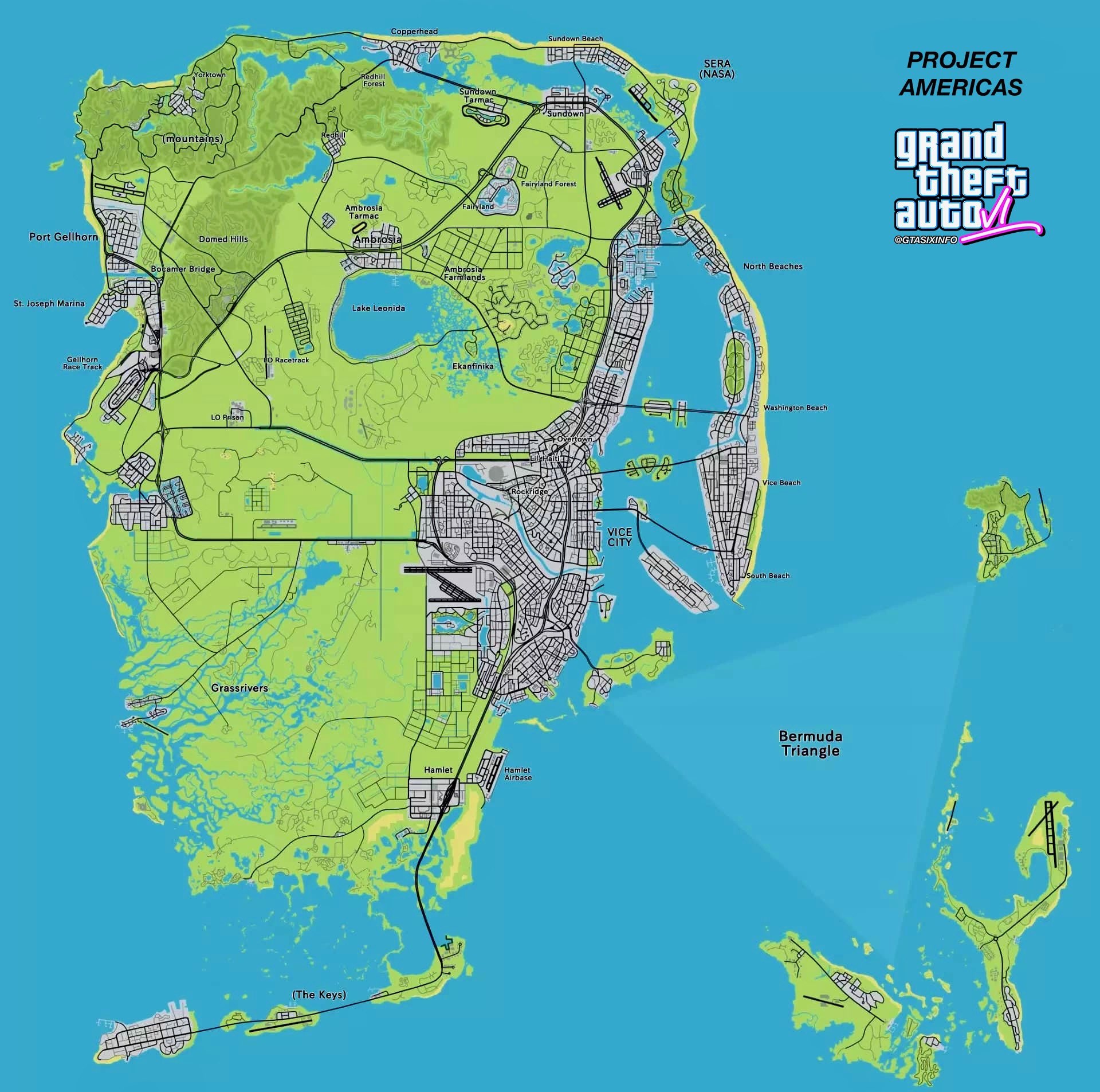 Pe scurt, jocul va include pe lângă orașul Vice City, despre care probabil știm cam cele mai multe informații, în legătură directă cu jocul din 2002 sau varianta mai puțin fericită remastered (Groaznic, I know ☹), Leonida Keys, zona sudică a statului Florida, cu insulițe și zone parcă scoase dintr-o poveste cu pirați, Grassrivers, un parc natural după modelul Everglades, Mount Kalaga, despre care putem intui că este ceva zonă mai accidentată, deluroasă sau muntoasă și pregătiți-vă … încă două orașe. Port Gellhorn este situat pe coasta vestică a hărții, opus față de Vice City, și Ambrosia, centrul industrial al statului Leonida, la răscrucea drumului ce leagă orașele anterior menționate. Mai jos veți regăsi o hartă postată de un fan pe Reddit ce pare să aproximeze destul de bine mărimea hărții și poziționarea diferitelor puncte de interes pe aceasta.
