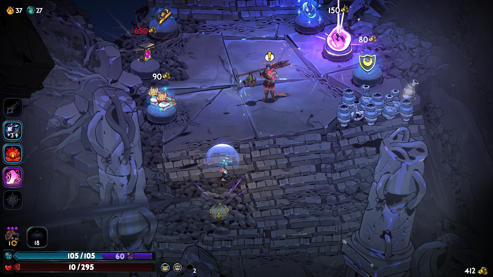 În Hades II există un singur dash, urmat de un sprint. E bine că s-a introdus mecanica de sprint/alergare, pentru că astfel tot poți traversa rapid arenele, dar aceasta trebuie activată prin apăsarea continuă a tastei de eschivă. Acest sprint, folosit tactic, nu doar că îți mărește viteza de deplasare, dar poate avea și efecte ofensive, în funcție de atributele alese de tine, care îi modifică funcționarea, cum ar fi generarea unei tornade la finalul cursei sau o dâră de foc lăsată în urmă care pârjolește inamicul.
