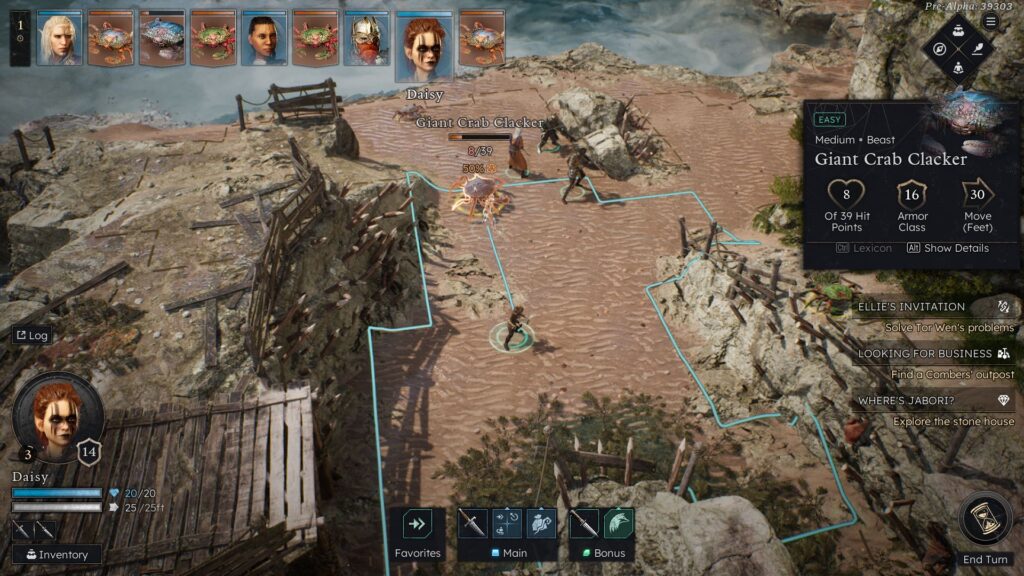 Dacă nu ai chef să mergi pe unde ți-au indicat autoritățile (primarul), poți să te deplasezi direct pe coastă și dai prima luptă. Sistemul de combat este turn based, așa că fiecare mișcare făcută de personajele tale, care au atât puncte forte cât și slăbiciuni, este ca într-un joc de șah. Personajele tale pot să atace, să facă vrăji, să vindece, să folosească obiecte sau orice combinații, în funcție de abilitățile lor. În luptă, acestea se deplasează pe un spațiu bine trasat, având o rază de mișcare limitată, o acțiune majoră de efectuat (adesea un atac melee sau de la distanță ori o vrajă), precum și alte acțiuni bonus. Întreaga provocare este să îți gestionezi poziționarea, precum și resursele de atac în timp ce trebuie să limitezi daunele suferite la minim. Folosirea mediului înconjurător devine rapid esențială, pentru că trebuie să-ți faci prieteni râul, ramul sau stâncile din preajmă. Dacă îți calculezi bine pașii, ai rezolvat o mare parte dintre probleme. Dar, norocul se mai uită și la fața omului, așa că trebuie să te rogi ca zarurile să fie de partea ta, căci aproape toate atacurile sau chiar alegerile din opțiunile de dialog sunt supuse hazardului, ca în orice clasic Dungeons & Dragons. Fiecare acțiune, fie că este vorba de dialog, atac, explorare sau investigare, se reduce la aruncarea zarurilor. De exemplu, uneori, sabia ta poate rata complet adversarul, după care acesta te lovește perfid în moalele capului și îți ia jumătate din bara de health cu o adiere de clește, în cazul crabilor.