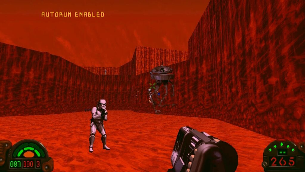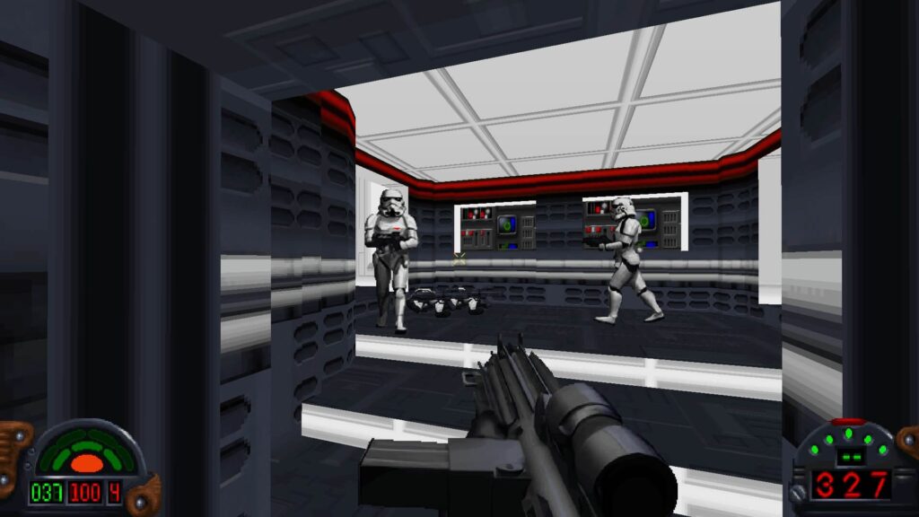 Ca să vă dau o imagine de ansamblu, varianta originală a jocului, lansată pe anticul DOS în 1995, a fost primul FPS plasat în universul Star Wars, alimentat de motorul grafic Jedi, dezvoltat în întregime în ograda Lucas Arts. Net superior față de DOOM, sau clone ale acestuia(heh), engine-ul lui Dark Forces a permis echipei de producție să blagoslovească fanii genului cu un design de nivel ce permitea niveluri suprapuse, verticalitate, geometrie complexă și mecanici de gameplay proaspete. De pildă, nivelurile erau gândite ca jucătorul să îndeplinească un set de obiective, nu doar să alerge de colo-colo și să se mulțumească să împuște inamici. Aveai de salvat domnițe la ananghie, de șterpelit planuri secrete pentru vreo armă secretă imperială, și câte și mai câte, și după toată tevatura asta, trebuia să ții minte drumul de întoarcere către începutul nivelului, căci doar așa partenera ta, Jan Ors, te putea exfiltra, și îți duceai misiunea la bun sfârșit. Povestea, plasată între A New Hope și The Empire Strikes Back, nu-i nici ea de ici de colo, cu siguranță mult mai elaborată decât ce era prezentată în vreo clonă de DOOM (heh, din nou) din acea perioadă.