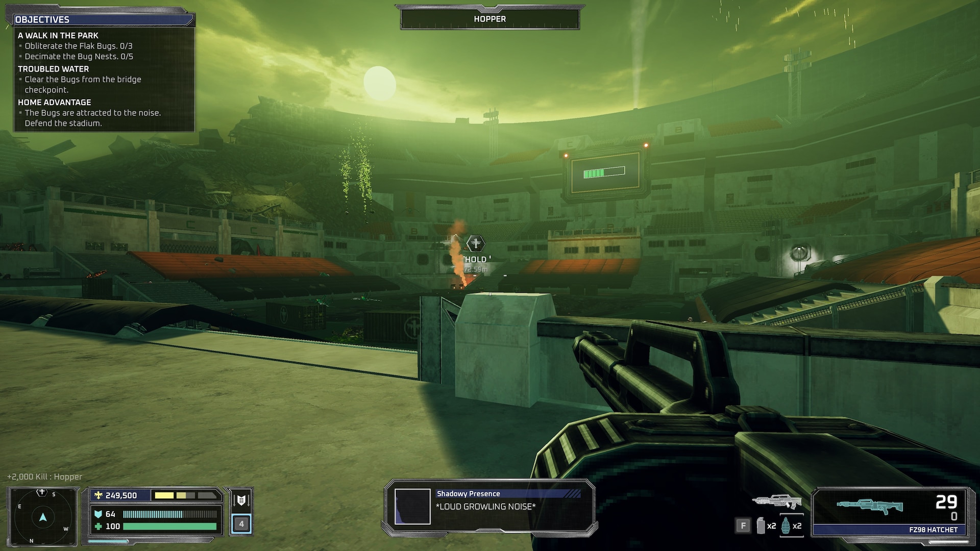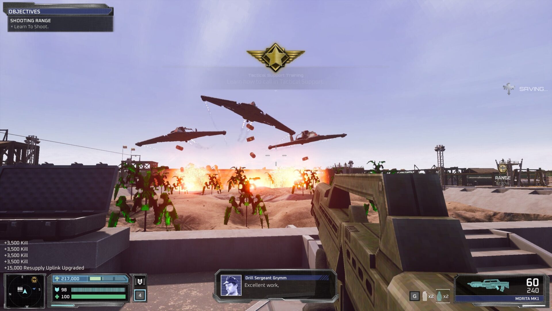 Armele sunt decente, au și moduri alternative, dar majoritatea arsenalului constă în variații de pușcă standard Morita în vreo trei configurații și se simte că nu au adăugat mare lucru în plus la versiunea finală. Sau oi fi eu prea cârcotaș? Posibil, dar mi-aș fi dorit o mai mare varietate a arsenalului. Apoi mai ai suport precum bombardament aerian, dropship, sau reaprovizionare cu echipament. Mecanic, partea de shooting e ok, nu ceva spectaculos, dar solid. Problema e că nimic din sistemele astea nu evoluează. După câteva ore, nu mai descoperi nimic nou. Totul devine o repetiție ușor diferită a aceleiași formule, și după vreo 4 ore te trezești că ai terminat jocul…