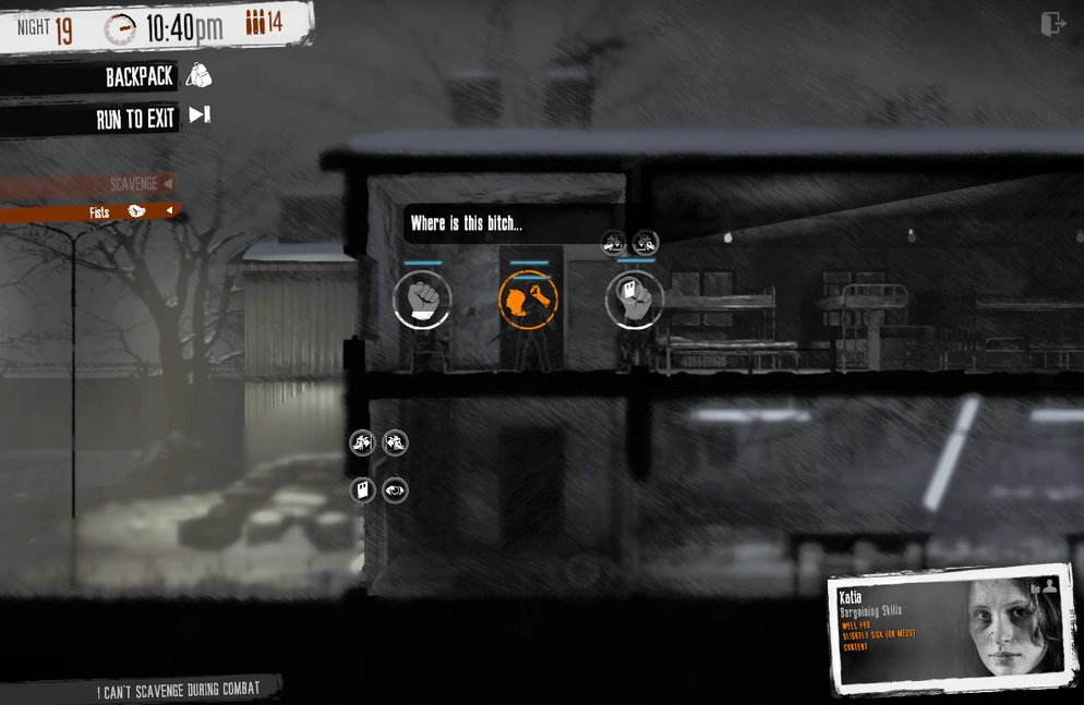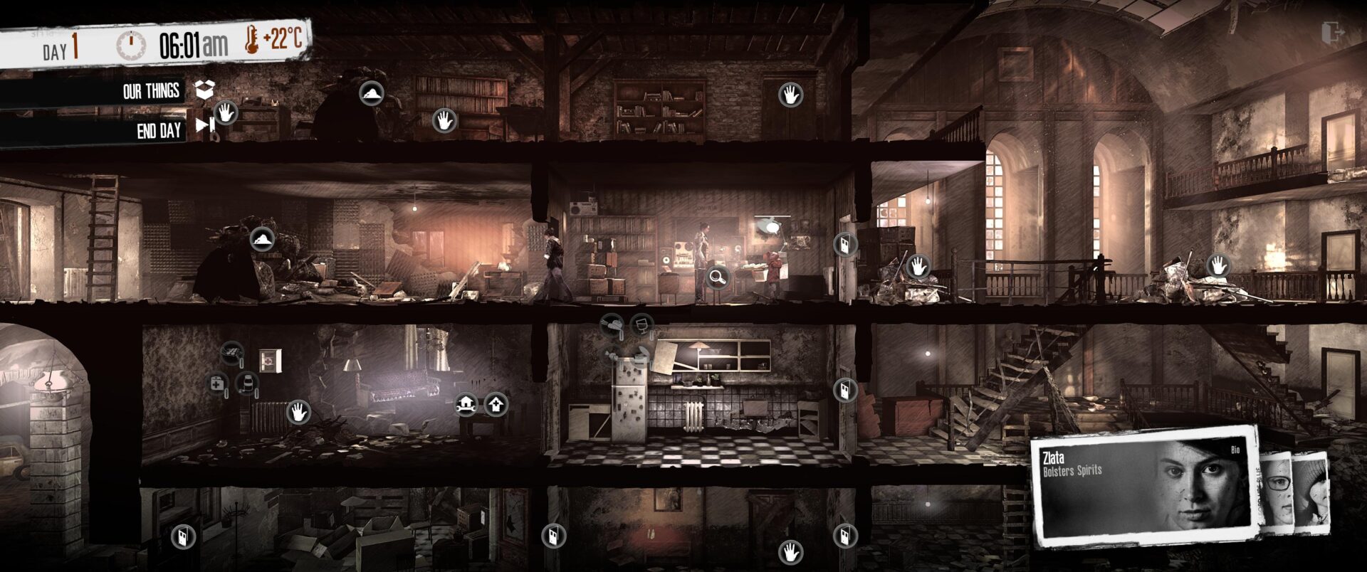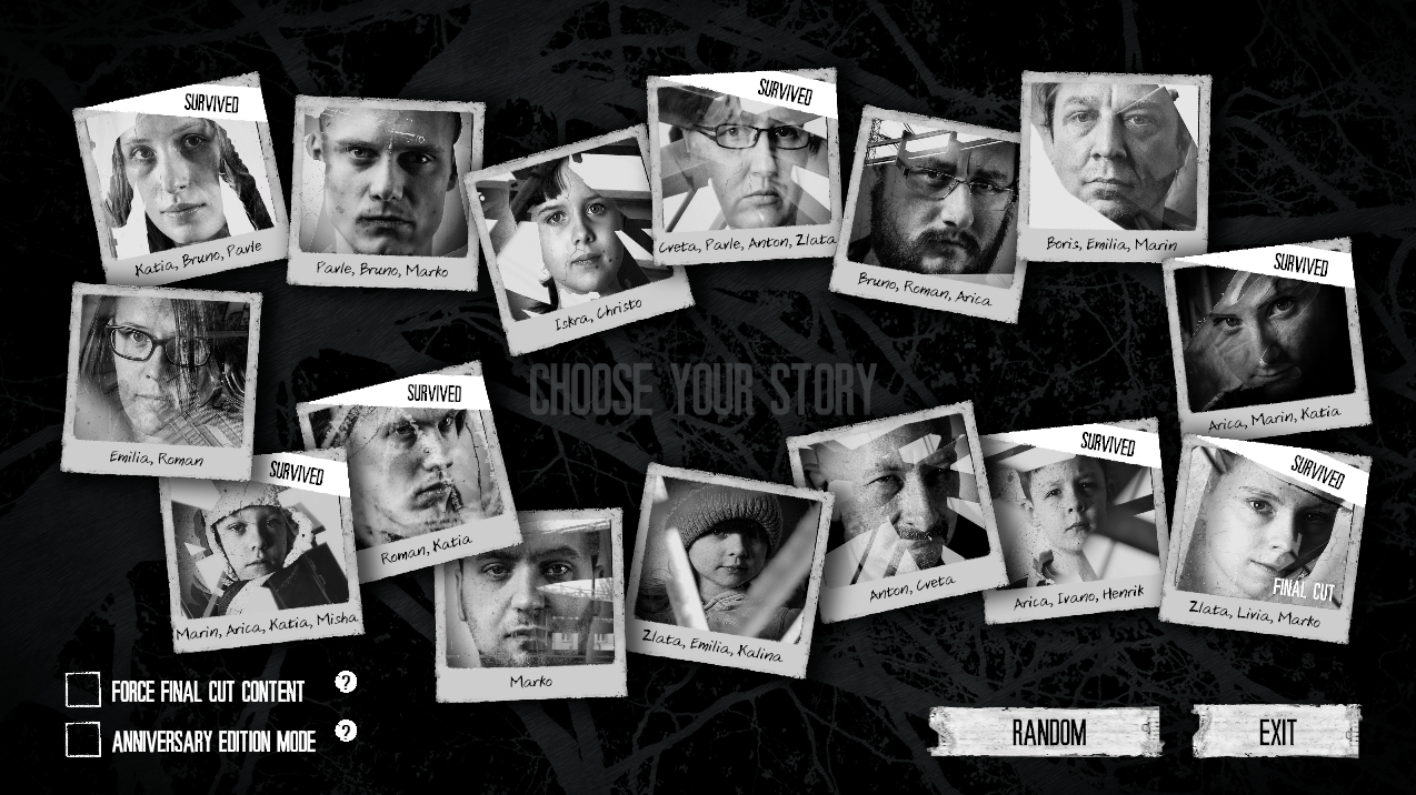 Cu fiecare zi trecută, personajele pe care le controlăm ni se dezvăluie încet, scriind în jurnal despre evenimentele pe care le-au trăit înainte de a porni războiul, sau în timpul războului, înainte de a ajunge cu noi în casă. Fiecare poveste are ceva dificil de înghițit, cu evenimente de la triste la depresive, dar foarte verosimile și similare cu ce un jucător posibil să fi simțit în viața reală. Eu cel puțin nu am fost într-un război, dar am cunoscut foame/mâncat o dată la 2 zile sau angoasă sau sentimente de regret datorită unor decizii proaste pe care le-am făcut în trecut.