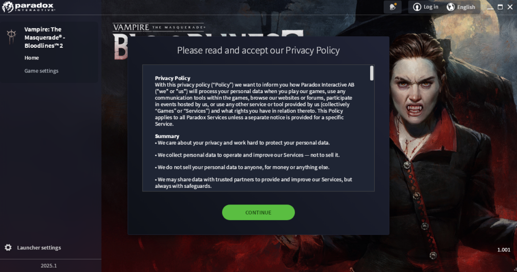 Dublu click pe jocul proaspăt cumpărat și instalat, suntem asaltați de Paradox Launcher. Acesta a fost un moment în care m-am blocat, pentru că, aveam pregătită o flegmă imensă, gata de lansare, dar de curând mi-am upgradat monitorul la un OLED și am zis că nu-i dau damage fatal în primele luni de folosire. Care este scopul? Nu avem încă DLC-uri de instalat. Mă refer la cele gratis, că pe viitor vor fi din alea plătite, fie-i Paradoxului țărâna ușoară, iar Mods există deja pe NexusMods, dar în veci pururi nu par a fi chestii pe care Paradox să le bage în Bloodlines 2. Și… și mai rău: acest joc NU este Stellaris! Nu este Crusader Kings! Nu are nici în clin, nici în mânecă cu grand-strategy-uri istorice. De ce, în numele falusului lui Beelzebub ai pune un Launcher în Bloodlines 2?!