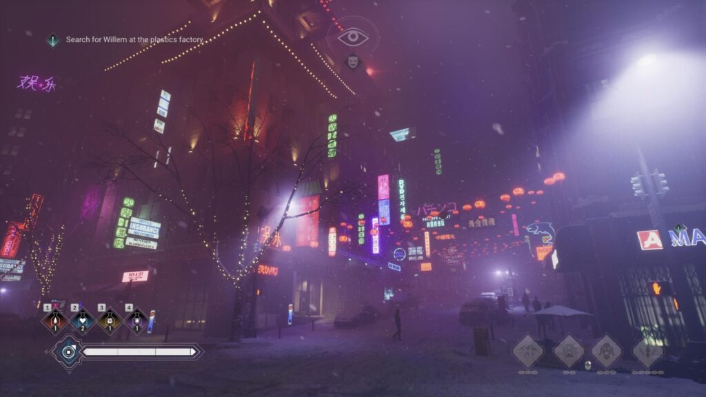 În Bloodlines 2 primești experiență la fiecare kill, așa că ești mânat să farmezi omoruri, și să faci quest-uri secundare. Iar quest-urile secundare sunt de un cretinism maxim. Ai trei feluri din care să alegi. „Du-te și ridică un pachet”, „Omoară persoana X” și „Urmărește mirosul victimei prin oraș și dă-i omorul”. Între misiunile principale, poți face câte una, UND PRECISELY UNA din fiecare tip de misiune secundară. E un fel de grind care din nou aduce a personaj de level mic dintr-un MMO de duzină. E o muncă anostă și obositoare pentru a farma experiență ca să îți faci viața mai ușoară în viitor, dar nu ești motivat de nimic altceva. Nu ai parte de nici un fel de dialog interesant în plus, nu cunoști personaje noi, nu nimic. Și nici nu ai misiuni pe care să le ții minte după ce le-ai terminat. Dezastru.