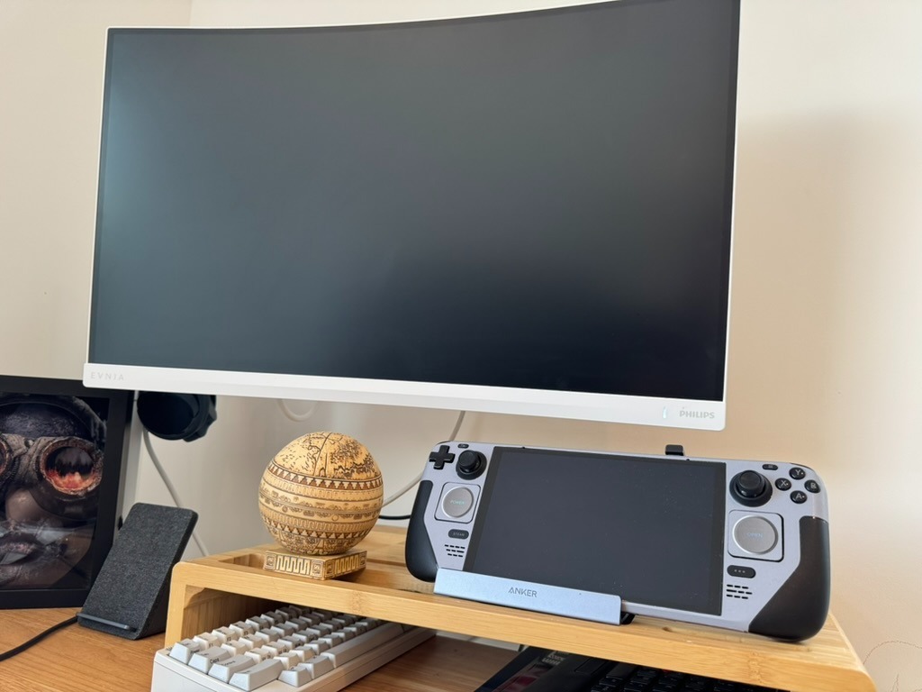 Jocurile mai grele, titlurile care cer resurse serioase, se comportă diferit când conectez Steam Deck-ul la monitorul de 1440p. Rezoluția nativă a ecranului propriu e de 1280×800, iar la 1440p prin dock, hardware-ul simte diferența. Nu dramatic, nu catastrofal, dar simte. Soluția e simplă și pentru mine complet acceptabilă: joc la rezoluție mai mică. Am crescut cu MS-DOS și CGA, am jucat Ultima pe un monitor care afișa patru culori. Un joc modern la 1080p pe un monitor 1440p nu îmi strică somnul.